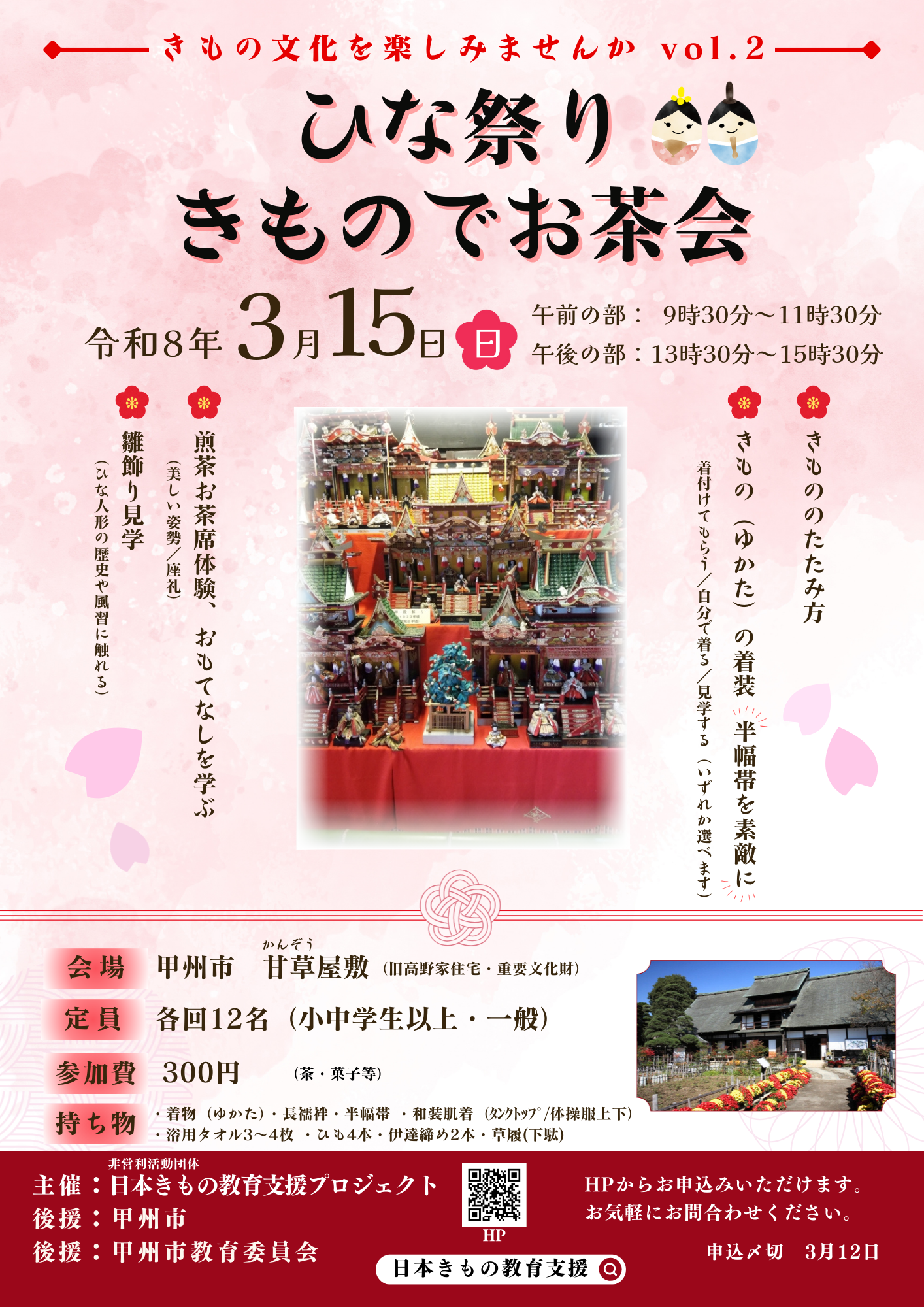 きものを着、お茶席体験やひな祭りの文化を楽しむ…